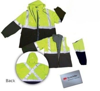 The outer parka includes reflective tape, a YKK zipper, an attached hood, secure pockets, and an adjustable fit. The inner reversible jacket has a warm fleece lining, removable sleeves to convert into a vest, and extra reflective detailing.