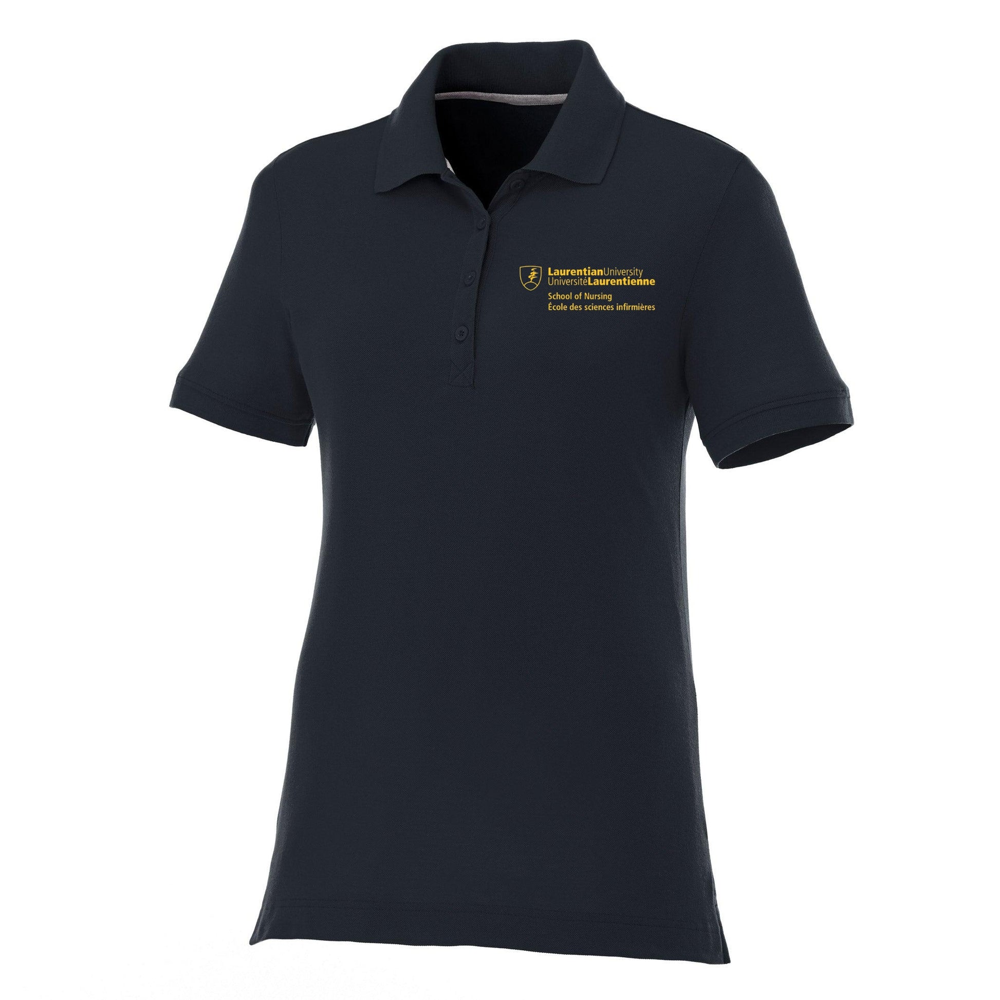 The Laurentian University Nursing Short Sleeve Polo is a Polyester Cotton blend pique knit with a 4-button placket, dyed-to-match buttons, flat knit collar and sleeve cuffs and other well-constructed features.